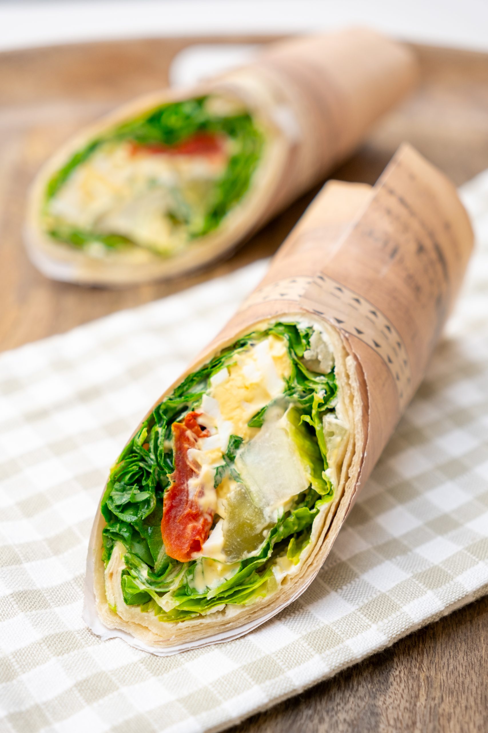 Œuf mimosa, tomate séchée, cornichon, salade romaine, roquette